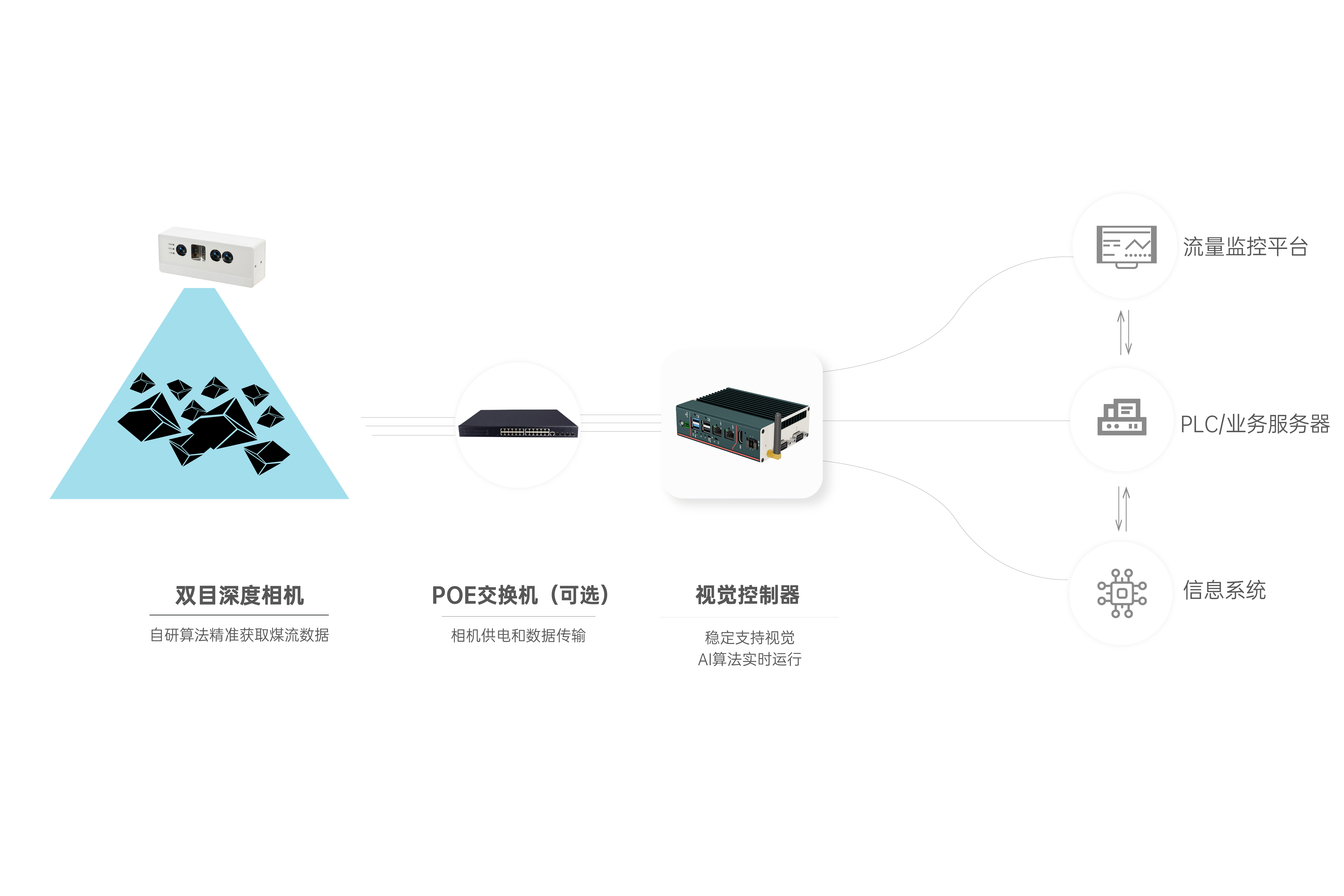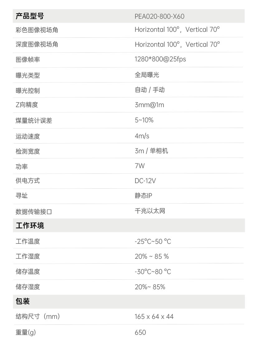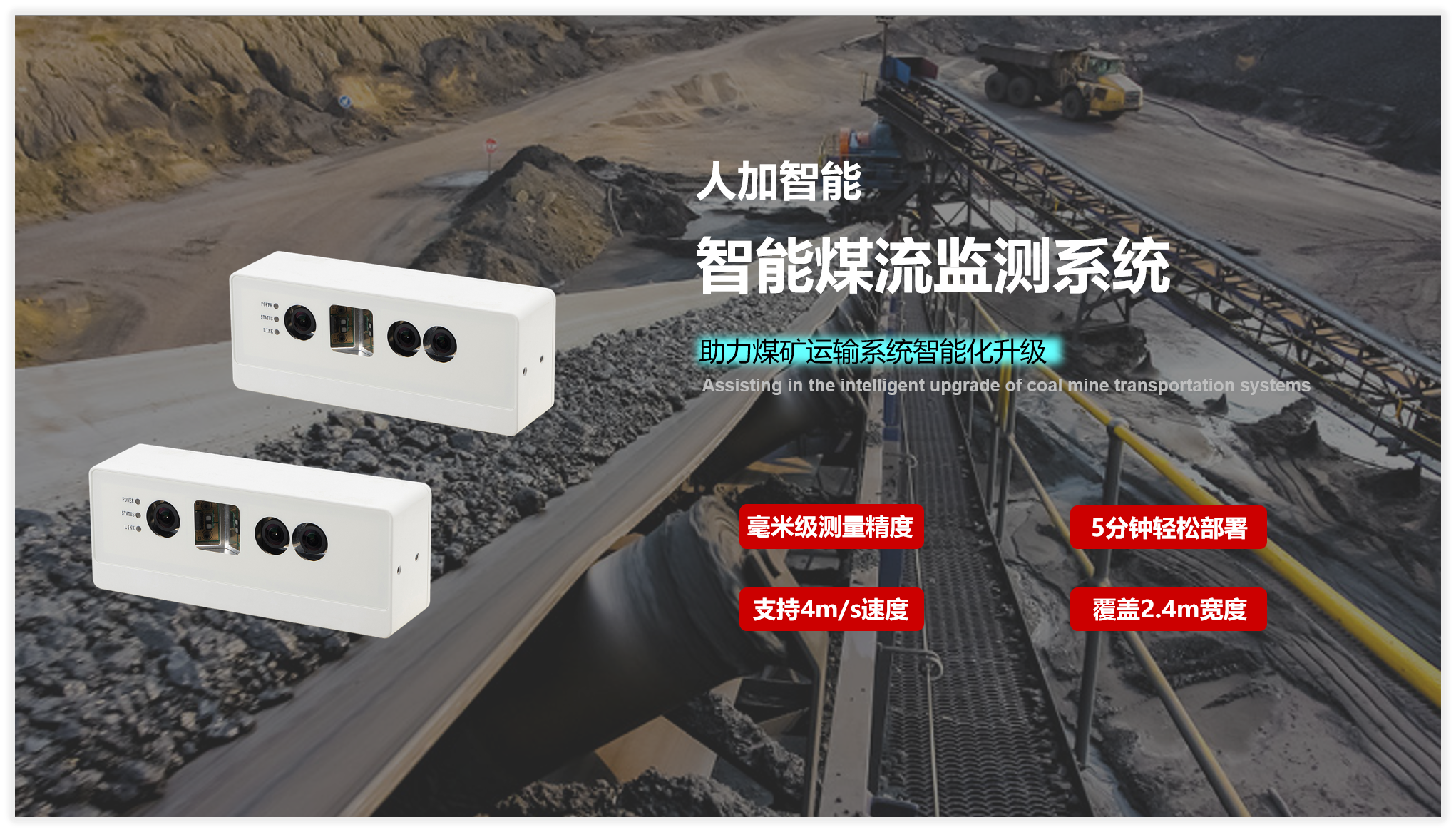 首页 动态 场景应用丨米兰milan智能智能煤流监测系统全新升级,赋能自动化煤流管控 场景应用丨米兰milan智能智能煤流监测系统全新升级,赋能自动化煤流管控 场景应用 2024-07-08 浏览量:2242 煤矿行业中,生产安全和节能降耗是两大痛点问题,在实际运煤过程中,跑偏、摩擦生热、堆煤、皮带撕裂等故障常造成重大安全事故,运输轻载和空载仍匀速运行会出现“以小拉大、无效运转”,导致能源大量浪费。 目前,传统测量设备智能化检测程度低,维护人员多,人力成本高,影响生产效率;皮带秤是采用较多的称重仪器,而在体积测量场景不易直接实现,而激光三维扫描测重系统价格昂贵,难以普遍使用。 如何通过提升皮带输送机采集精准数据能力,减人降耗,提高安全防范,进行自动化管控成为煤矿行业亟待解决的问题。 米兰milan智能智能煤流监控管理系统,基于双目立体视觉技术实现精准的数据检测和输送带控制。系统由3D相机硬件、嵌入式计算平台、流量监测平台构成,实现输送带煤量监测统计,堆煤监测、块煤监测、异物监测、跑偏监测、撕裂监测等功能,以采集的精准数据为智能调速、皮带运输安全检测等智能化改造提供助力,达到减人增效,节能降耗的目标。该系统环境环境适应强,部署简单,无需改造现场环境即可安装。 司眸®智能煤流监测管理系统应用于某煤流监测项目 产品介绍 米兰milan智能智能煤流监测管理系统采用自研非接触智能煤流RGBD相机,搭载输送机煤流监测智能管理平台,相机在AI算法加持下,能实时采集到高质量煤流RGBD数据,实现高速运输的煤炭皮带机进行多种智能化场景应用,易于部署,通过千兆网口直接对接PLC或服务器,安装便捷,无需改造现场环境,对环境光适应性强,不易受皮带颜色信息干扰。 系统应用功能 煤流统计 通过智能煤流RGBD相机采集动态输送机上的煤矿体积的三维数据,输出深度和彩色数据信息。该功能还可应用于输送带智能调速,生产数据管理,库存管理等智能化升级改造。 支持皮带速度:4m/s 粉煤煤量统计误差:≤5% 块煤监测 通过立体视觉技术,测量块状物的长宽数据,识别大块煤,输出高精度数据。 支持皮带速度:4m/s 异物监测 通过智能算法可识别大块矸石、铁器(锚杆、角钢)等非煤异物。 煤堆监测 在出料口、传送带上实时监测堆煤高度,实时输出堆煤结果。由此实现输送机安全监控,提前预防堆煤事故发生。 堆煤高度检测精度:毫米级 检测周期:秒级 最佳检测皮带宽度:600~2400mm 跑偏监测 根据智能相机安装位置定位皮带边缘位置,进行位置标定及设定跑偏阈值,通过获取的输送带三维尺寸位移信息,对皮带左右边缘位置与阈值比较并进行跑偏判断,输出跑偏结果。 左右皮带边缘定位精度:毫米级 检测周期:秒级 最佳检测皮带宽度:600~2400mm 智能煤流RGBD相机特点 01 高精度测量,保障数据准确 在高速动态检测上,测量精度可达毫米级,测量结果与实际煤量误差小于5%; 支持设备端断网续存,联网后相机前端与后台系统可保持数据同步。 02 适应性高,鲁棒性强,复杂场景可运行 抗强光、反光干扰:可抗强光、反光,自研算法支持煤矿等深色、黑色物体精准测量; 抗阴影干扰:在室内、地下、夜晚能稳定测量,无需补光; 多类型输送机适配:可适配平直型、U型、V型等各类型输送机; 适应于矿场粉尘、煤炭表面有水渍的情况; 结合算法对皮带输送时产生的震动进行自适应调整,减少测量误差; 针对井下场景可选用防爆硬件及井上应用工业级硬件设备,满足应用需求。 03 部署简单,安装便捷 出厂相机内参标定,可快速部署集成,无需改变现场环境即可安装,实施速度快,调试简单,系统易于维护。 04 接口丰富,数据直传 丰富的系统对接接口,可直接对接PLC、变频器、服务器,快速完成精细化皮带控制。 05 大景深、大视野,多范围应用 测量皮带宽度达2.4米; 测量煤堆高度达1.5米; 设备组合方案可支持更大视野。 05 边缘计算架构,实时测量 使用边缘计算架构,将多种智能算法在边缘端实现,保证数据实时传输。 RGBD相机参数 米兰milan智能深耕机器视觉领域近十年,垂直领域技术积累深厚,经过长期自主研发,现已推出系列体积测量方案,包括智能煤流监测管理系统、RGBD大货体积测量、动态包裹体积测量、静态包裹体积测量等,能够满足各领域不断增加的业务需求。 米兰milan一直秉持以服务客户为中心,将技术与产品创新作为对客户、行业和社会应尽的责任。未来,米兰milan智能将坚持科技创新,始终致力于数字化转型升级及智能化发展,促进全社会生产效益提升。 上一个:场景应用丨米兰milan智能3D视觉+AI深度学习,助超大型货物体积测量更准,更稳,更易用 返回列表 下一个:3D机器视觉可以完成许多2D机器视觉无法完成的任务。 更多新闻推荐 端到端 更易用丨米兰milan®散料运输动态监测与预警系统全新上市 新品上市 2025-02-20 小尺寸 更灵活丨米兰milan3D相机PEA020-800-Y80S上新,助力多场景智造升级 新品上市 2024-09-29 目前主流3D视觉技术各有什么优劣势?如何选择最Match的工业3D相机? 技术科普 2024-08-12 【最全选型攻略】挑选合适的工业相机,必须提前考虑12要素! 工业相机 2024-07-16 场景应用丨米兰milan智能3D视觉+AI深度学习,助超大型货物体积测量更准,更稳,更易用 场景应用 2024-06-04 超高读取 极致易用丨米兰milan智能发布RGBD动态包裹体积测量智能相机 新