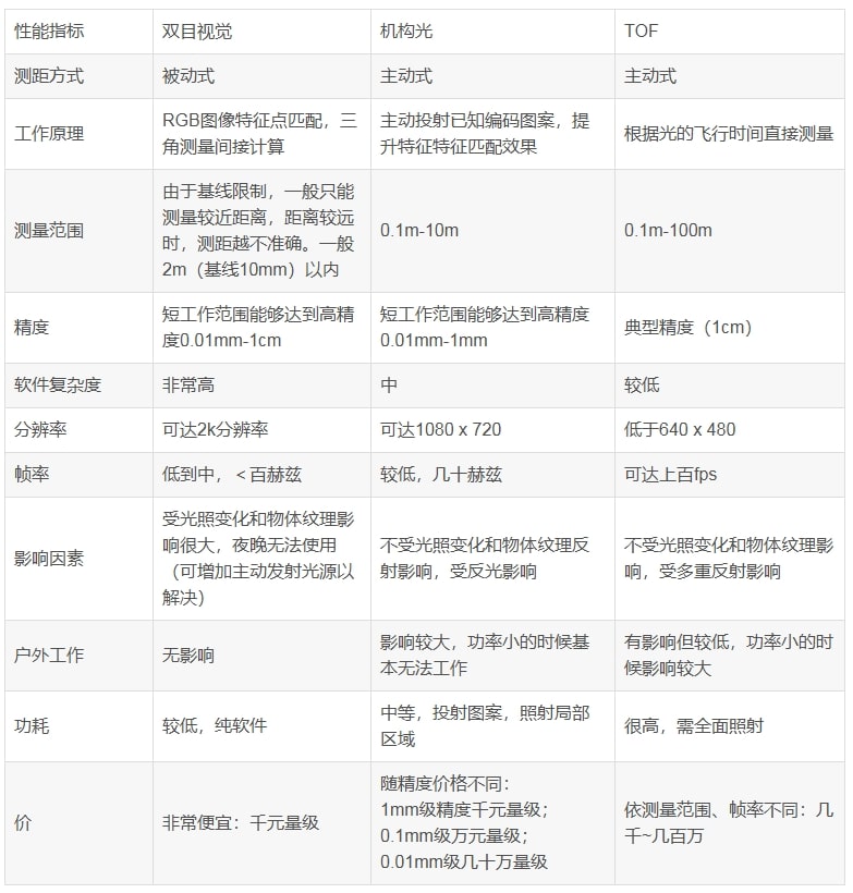 首页 动态 目前主流3D视觉技术各有什么优劣势?如何选择最Match的工业3D相机? 目前主流3D视觉技术各有什么优劣势?如何选择最Match的工业3D相机? 技术科普 2024-08-12 浏览量:1984 什么3D相机?3D相机与2D相机相比有什么差别? 3D相机,也被称作深度相机,与传统的2D相机相比,它能够多获取物体到相机的距离信息,即深度信息,结合2D图像的X和Y坐标,可以计算出每个点的三维坐标,从而实现三维重建、目标定位、导航避障等功能。 3D机器视觉可以完成许多2D机器视觉无法完成的任务。 以零件检测为例,下图零件表面有一划痕、边沿有凹陷。传统的2D机器视觉只能依靠表面图像颜色的不连续来判断是否缺陷,但此案例中,缺陷和零件表面反光颜色接近,判断难度很大,3D相机可以得到表面凹凸的深度信息,从而准确的判定划痕和边缘的凹陷。 此外,目前3D视觉技术在高精度检测、高精度测量(例如弯管、不规则件)、智能分栋、装配(引导机械臂在三维空间内避障和定位)、物流车导航等更多场景中实现了相较于2D机器视觉更为广泛的应用覆盖。 主流3D技术对比 3D相机的工作原理主要有三种技术:双目立体视觉、结构光和ToF(Time of Flight),还有其他市面上常见和新技术发展起来的相机种类。 1. 双目立体视觉基于视差原理并利用成像设备 从不同的位置获取被测物体的两幅图像,通过计算图像对应点间的位置偏差来获取物体三维几何信息。 一般立体视觉相机指的是被动式双目立体视觉相机,而主动式双目立体视觉相机是在双目立体视觉的基础上,增加了主动发射光源(通常是红外光)来辅助获取深度信息的相机系统,这种系统结合了被动双目视觉和主动发射光源的优势。 1. 被动式双目立体视觉相机 【优点】1)硬件要求低,功耗低,成本低。普通 CMOS 相机即可; 2)室内外都适用,尤其适合在户外工作; 3)适用于纹理丰富的场景。 【缺点】1)对环境光照非常敏感。光线变化导致图像偏差大,进而会导致匹配失败或精度低; 2)不适用单调缺乏纹理的场景。双目视觉根据视觉特征进行图像匹配,没有特征会导致匹配失败; 3)计算复杂度高。该方法是纯视觉的方法,对算法要求高,计算量较大; 4)基线限制了测量范围。测量范围和基线(两个摄像头间距)成正比,导致无法小型化。 2. 主动式双目立体视觉相机 通常是指在双目立体视觉的基础上,增加了主动发射光源(如红外光)来辅助获取深度信息的相机系统。这种系统结合了被动双目视觉和主动发射光源的优势。国内米兰milan智能是研究该领域的专业企业。 【优点】1)低光场景可用:可在户外使用,同时也可在低光或无光环境工作,提高图像可见度和深度测量准确性; 2)增强纹理信息:为缺乏纹理的表面增加必要纹理信息,适合表面光滑和颜色单一场景; 3)降低环境光干扰:使用红外或特定波长的光源可以减少环境光变化对系统性能的影响。 【缺点】1)功耗增加:使用外部光源可能会增加系统的功耗,尤其是在需要长时间运行的应用中。 2)安装和校准:需要更精确的安装和校准过程,以确保光源和相机之间的正确对齐。 结构光 通过近红外激光器,将具有一定结构特征的光线投射到被拍摄物体上,再由专门的红外摄像头进行采集。这种具备一定结构的光线,会因被摄物体的不同深度区域,而采集不同的图像相位信息,然后通过运算单元将这种结构的变化换算成深度信息,以此来获得三维结构。 根据编码图案不同一般有:条纹结构光、编码结构光、散斑结构光。 【优点】1)方案成熟,相机基线可以做的比较小,方便小型化。 2)资源消耗较低,单帧 IR 图就可计算出深度图,功耗低。 3)主动光源,夜晚也可使用。 4)在一定范围内精度高,分辨率高,分辨率可达 1280x1024,帧率可达 60FPS。 【缺点】1)容易受环境光干扰,室外体验差。 2)随检测距离增加,精度会变差。 TOF 顾名思义是测量光飞行时间来取得距离,具体而言就是通过给目标连续发射激光脉冲,然后用传感器 接收从反射光线,通过探测光脉冲的飞行往返时间来得到确切的目标物距离。 因为光速激光,通过直接测光飞行时间实际不可行,一般通过检测通过一定手段调制后的光波的相位偏移来实现。 TOF 法根据调制方法的不同,一般可以分为两种:脉冲调制(Pulsed Modulation)和连续波调制 (Continuous Wave Modulation)。 脉冲调制需要非常高精度时钟进行测量,且需要发出高频高强度激光,目前大多采用检测相位偏移办法来实现 TOF 功能。简单来说就是,发出一道经过处理的光,碰到物体以后会反射回来,通过捕捉来回的时间计算距离。 【优点】 1)检测距离远:在激光能量够的情况下可达几十米。 2) 受环境光干扰较小。 【缺点】 1)对设备要求高,特别是时间测量模块; 2)资源消耗大。 该方案在检测相位偏移时需要多次采样积分,运算量大。 3)边缘精度低。 4)限于资源消耗和滤波,帧率和分辨率都没办法做到较高。 三种技术性能对比 上一个:【最全选型攻略】挑选合适的工业相机,必须提前考虑12要素! 返回列表 下一个:3D机器视觉可以完成许多2D机器视觉无法完成的任务。 更多新闻推荐 端到端 更易用丨米兰milan®散料运输动态监测与预警系统全新上市 新品上市 2025-02-20 小尺寸 更灵活丨米兰milan3D相机PEA020-800-Y80S上新,助力多场景智造升级 新品上市 2024-09-29 【最全选型攻略】挑选合适的工业相机,必须提前考虑12要素! 工业相机 2024-07-1