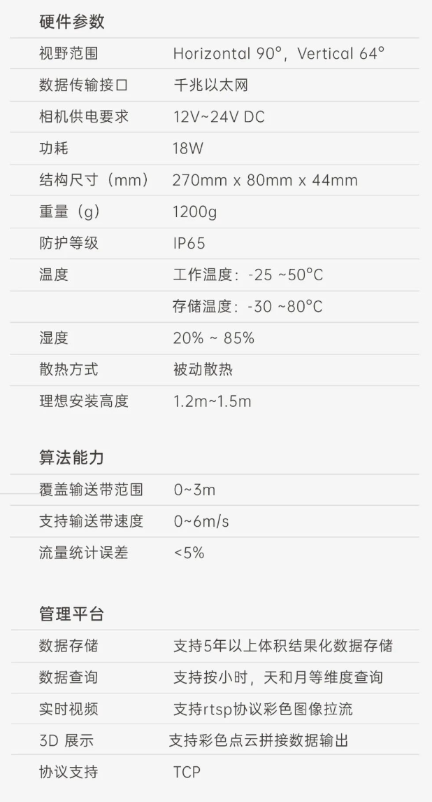 首页 动态 端到端 更易用丨米兰milan®散料运输动态监测与预警系统全新上市 端到端 更易用丨米兰milan®散料运输动态监测与预警系统全新上市 新品上市 2025-02-20 浏览量:164 在各类涉及散料运输的行业场景中,普遍面临着诸多棘手问题,严重影响生产效率、成本控制以及生产安全,作为具备端到端能力的 3D 视觉智能化解决方案专家,米兰milan机器人公司正式推出软硬件一体化智能散料运输动态监测与预警系统,护航全场景散料运输,助力多行业生产效率提升。 方案介绍 米兰milan®散料运输动态监测与预警系统 司眸® RGBD 智能相机 司眸®VAE020-800-X180是米兰milan机器人公司最新自主研发的升级款 工业级RGBD感算一体式智能相机产品,基于双目散斑结构光感知技术,异构3D实时成像技术提供更精细的深度感知,在SLAM、三维重建技术加持下,提升点云数据精度和图像处理能力,升级的增强光学投射系统,缩短曝光时长,减少运动模糊,更适用于高速场景。 智能料流检测软件 米兰milan公司智能料流检测软件,内置自研高精度料流测量算法,可全面监测输送带的运行速度、流量体积、堆料高度、块料大小、欠载状态、皮带跑偏等信息,实现输送带散货物流精细化监测。 监测管理平台 客户端软件支持实时视频查看、历史数据查询、实时人机交互控制。 系统功能 流量统计 司眸®VAE020-800-X180 RGBD 智能相机动态采集输送带上物料的三维数据,结合高精度流量体积测量算法,生成精准流量体积数据。 支持皮带速度:6m/s 数据查询:支持按小时、天和月等维度查询 自动测速 该方案能够自动测量输送带运动速度,确保及时发现异常,结合报警系统可防止设备故障或安全事故,同时实现料流精细化控制,优化输送调度,提升输送效率。 环境条件:需具备照明条件 覆盖输送带宽度:0 ~ 3m 块料检测 通过三维点云数据分析,能够识别自定义参数范围出现的块料,并突出标记,同时实时跟踪,并进行系统预警。 支持皮带速度:≤ 6m/s 块料参数自定义:支持 煤堆监测 实时监测料流高度,当发现料流高度过高可能导致物料堆积堵塞时,及时预警。 检测精度:毫米级 覆盖皮带宽度:0~3m 欠载检测 当检测到料流高度过低时,表明输送带此时处于欠载状态,系统可及时预警,消除生产安全隐患,提升生产效率。 检测精度:毫米级 覆盖输送带宽度:0~3m 跑偏检测 自主设定跑偏阈值,算法自动比较皮带实时偏移量和设定阈值,判断输送带是否偏离正常轨道,输出计算跑偏幅度和方向,显示具体数值,同时可及时发出警报。 检测精度:毫米级 覆盖输送带宽度:0~3m 核心优势 01 高精度测量,数据稳定输出 测量精度可达毫米级,测量结果与实际物料流量误差小于5%; 支持深度数据和RGB数据同步对齐输出; 02 超大景深,超宽视野 测量输送带宽度达3m; 测量堆料高度达1.5m; 03 部署简单,安装便捷 无需改变现场环境即可快速安装; 调试简单,系统易于维护; 04 端侧AI,架构简洁 数据传输延迟更低; 不需要额外工控机计算设备; 更省安装与维护成本; 05 一个平台,多个应用 单机实现散料皮带流量监控、堆煤、跑偏、测速等多种应用; 06 RGBD应用开发平台 司眸®RGBD智能相机可作为应用开发平台,持续衍生出更多闭环应用; 07 快速响应防爆需求 针对防爆需求,提供10mm厚度防爆玻璃解决方案,确保在防爆环境下正常使用而不影响3D成像效果; 方案能力 应用场景 Human+™米兰milan®深耕机器视觉领域近十年,3D 视觉 AI 技术积累深厚,经过长期自主研发,现已推出A系列、P系列,T系列、AT系列双目 3D 相机产品,基于自研 3D 相机,为客户和合作伙伴提供端到端的「3D 视觉+AI 」 自动化解决方案,打造软硬件一站式闭环服务体验。 米兰milan一直秉持以服务客户为中心,将技术与产品创新作为对客户、行业和社会应尽的责任。未来,Human+™米兰milan®将坚持探索前沿科技创新,始终致力于各行业智能化转型升级,促进全社会生产效益提升。 上一个:小尺寸 更灵活丨米兰milan3D相机PEA020-800-Y80S上新,助力多场景智造升级 返回列表 下一个:没有了 更多新闻推荐 小尺寸 更灵活丨米兰milan3D相机PEA020-800-Y80S上新,助力多场景智造升级 新品上市 2024-09-29 目前主流3D视觉技术各有什么优劣势?如何选择最Match的工业3D相机? 技术科普 2024-08-12 【最全选型攻略】挑选合适的工业相机,必须提前考虑12要素! 工业相机 2024-07-16 场景应用丨米兰milan智能智能煤流监测系统全新升级,赋能自动化煤流管控 场景应用 2024-07-08 场景应用丨米兰milan智能3D视觉+AI深度学习,助超大型货物体积测量更准,更稳,更易用 场景应用 2024-06-04 超高读取 极致易用丨米兰milan智能发布RGBD动态包裹体积测量智能相机 新品发布 2024-04-26